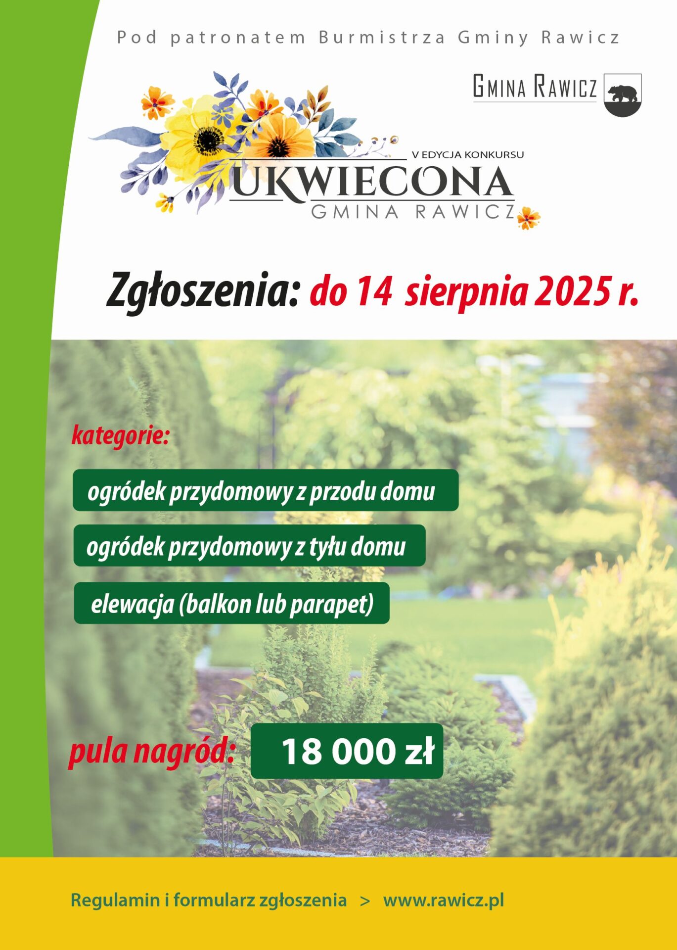 Piękne ogrody, kolorowe balkony, zadbane elewacje - wszystko to wpływa na estetykę naszej codzienności. W trosce o wspólne otoczenie i promocję zielonych inicjatyw, Gmina Rawicz ogłasza konkurs „Ukwiecona Gmina Rawicz”, skierowany do mieszkańców, którzy z pasją pielęgnują swoje przydomowe przestrzenie.