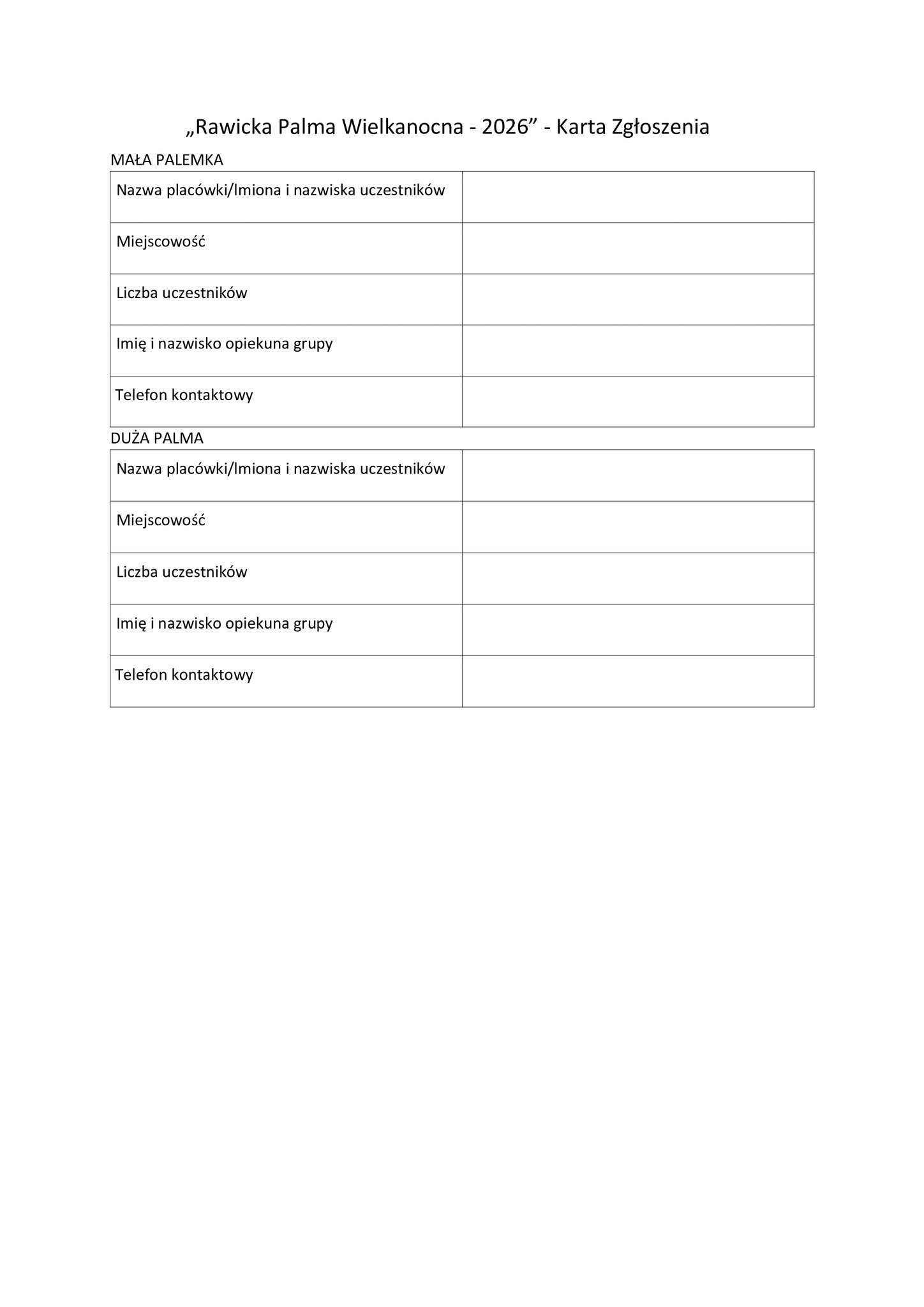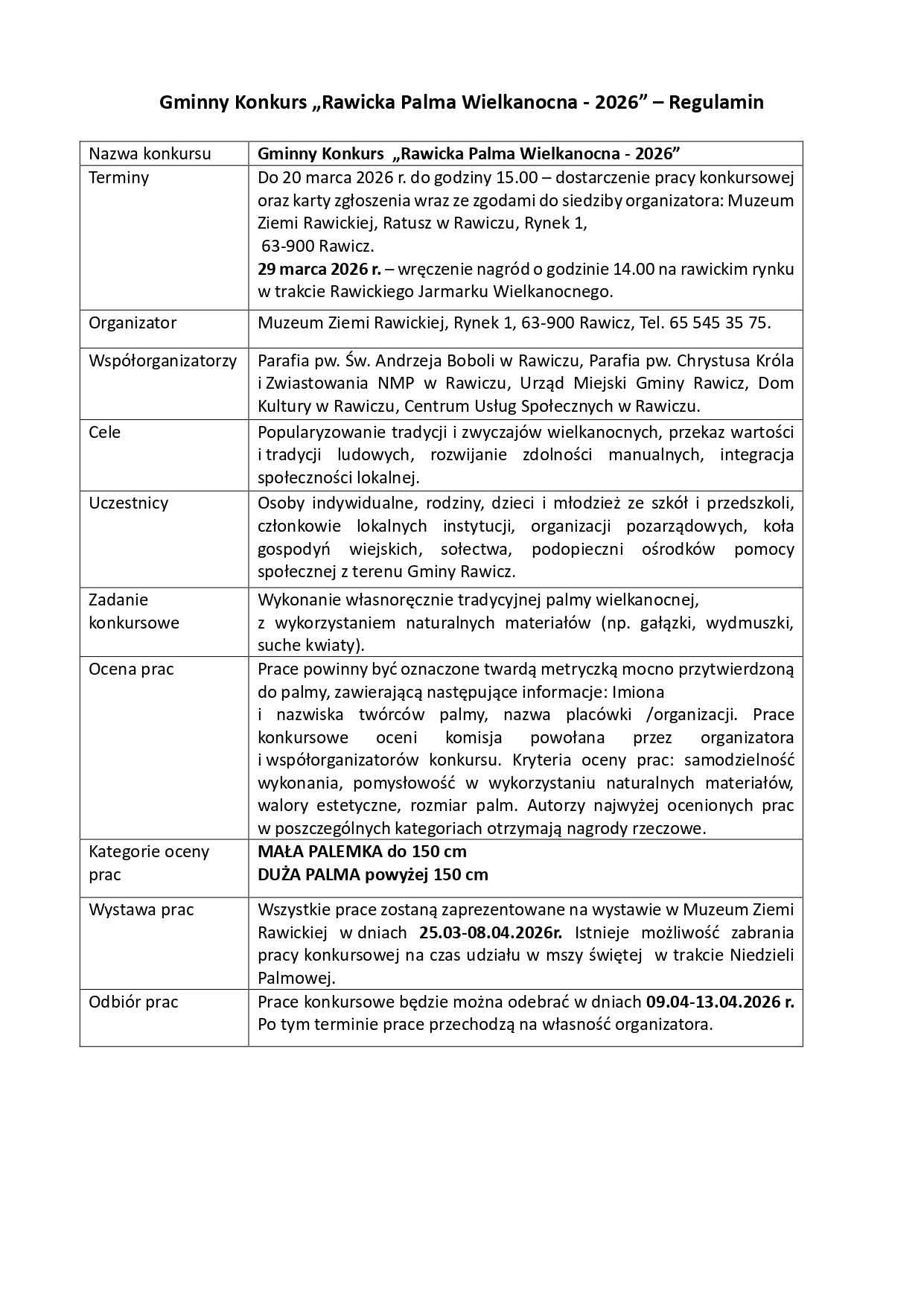 Prace konkursowe należy składać do 20 marca w biurze Muzeum Ziemi Rawickiej. Wystawa zgłoszonych palm odbędzie się w dniach 25 marca - 8 kwietnia 2026 roku w siedzibie Muzeum. Uroczyste wręczenie nagród zaplanowano na 29 marca podczas Jarmarku Wielkanocnego na rawickim rynku.