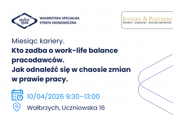 Przedsiębiorcy! Zachęcamy do zapoznania się z ofertą spotkania pt. „Kto zadba o work-life balance pracodawców. Jak odnaleźć się w chaosie zmian w prawie pracy.” organizowanego przez Wałbrzyską Specjalną Strefę Ekonomiczną „INVEST PARK” we współpracy z kancelarią Staniek & Partners.