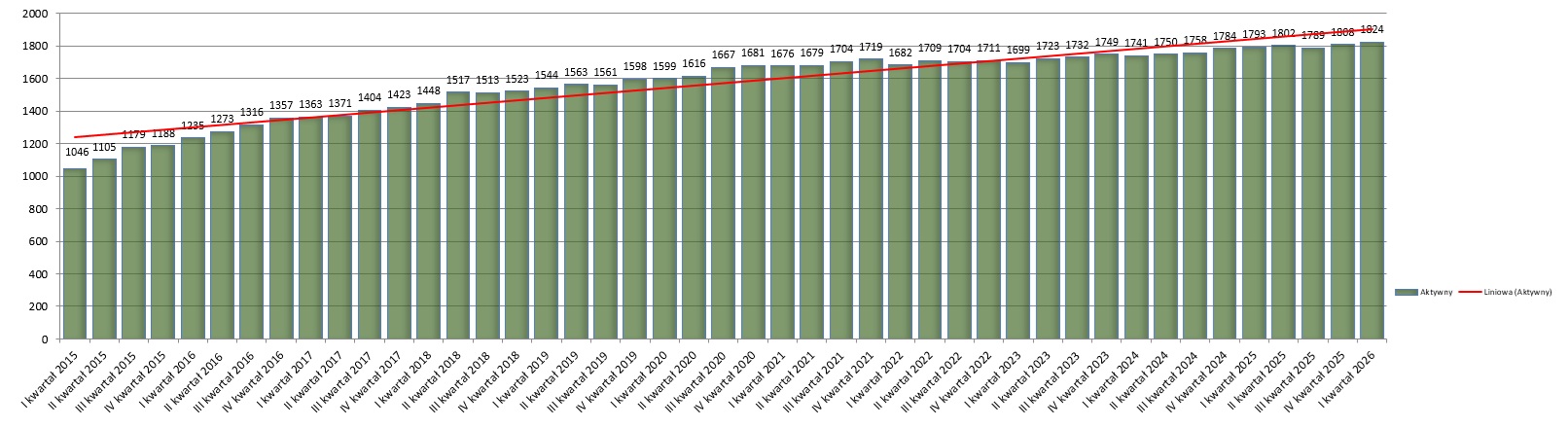 Zestawiając dane od I kwartału 2015 roku obserwujemy tendencję wzrostową. I kwartał 2015 roku - 1046 aktywnych wpisów, I kwartał 2026 roku - 1824 aktywnych wpisów. To wzrost o 778 aktywnych wpisów.